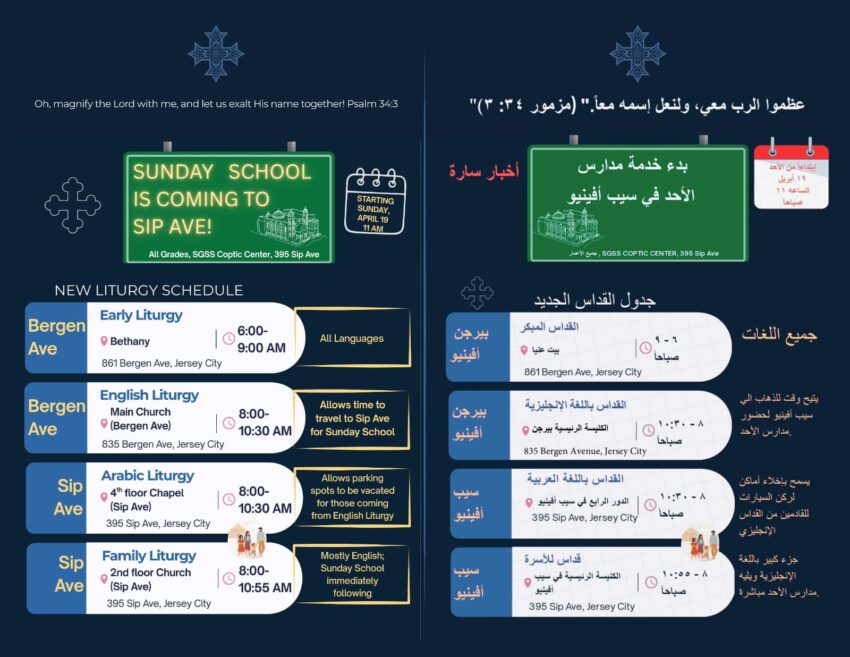 Sunday School is Coming to our Coptic Center Posted on April 16, 2026 Share this: Share on Facebook (Opens in new window) Facebook Share on X (Opens in new window) X Share on WhatsApp (Opens in new window) WhatsApp Share on LinkedIn (Opens in new window) LinkedIn Print (Opens in new window) Print Like this:Like Loading... Read more